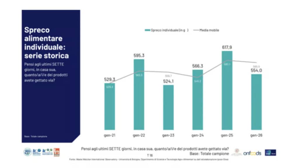 Il Report Italia 2026 fornisce un’indicazione chiara: la quantità di cibo domestico buttato nell’ultimo anno è diminuita del 10%. Attualmente siamo a 554 grammi a settimana.