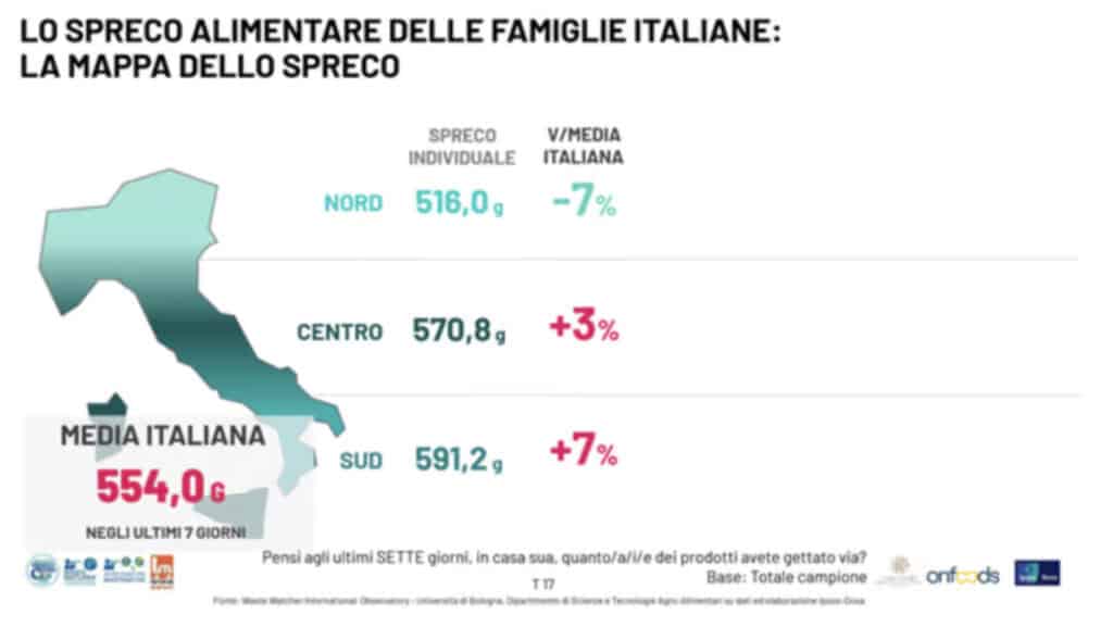 Restano però differenze marcate lungo la penisola. Nel Italia il Nord spreca meno della media nazionale, mentre Centro e Sud mostrano valori leggermente superiori.