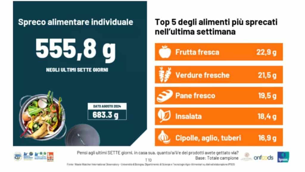 I dell’Osservatorio Waste Watcher evidenziano un calo del 19%: in una settimana media si passa dai 683 grammi del 2024 ai 556 del 2025. Rimangono forti differenze regionali.