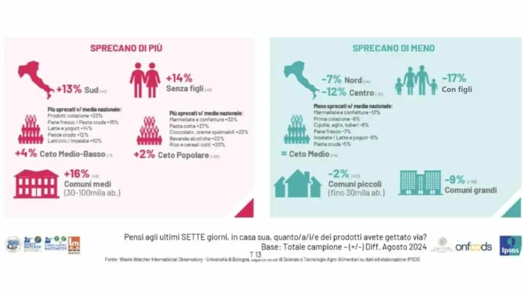 Anche i profili familiari mostrano notevoli differenze. I nuclei senza figli risultano i più spreconi (+14%), mentre chi ha bambini registra un -17% rispetto alla media. Dal punto di vista socioeconomico, sprecano di più le famiglie appartenenti al ceto medio-basso (+4%) e al ceto popolare (+2%), con un dato particolarmente rilevante: tra quest’ultimo gruppo si osserva un aumento del 25% rispetto al 2024.