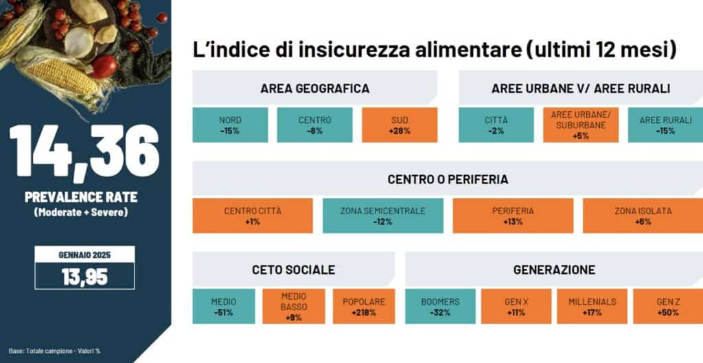 L’indice di insicurezza alimentare è uno dei dati di riferimento del Rapporto “Il caso Italia 2026” di Waste Watcher: misura la difficoltà di accesso a cibo sufficiente, sicuro e nutriente, utilizzando strumenti come la scala FIES (Food Insecurity Experience Scale) dell’ONU, che indaga la preoccupazione, la qualità e la quantità del cibo. La nuova rilevazione denota un significativo aumento nell’allarme sociale, perché l’indice sale di mezzo punto rispetto all’ultima rilevazione 2025, toccando quota 14,36 – confermandosi quindi un fenomeno strutturale e non marginale – con un incremento del 28% a sud e addirittura del 50% per i giovani della generazione Z. Se il divario territoriale è netto, il rischio si presenta molto più elevato nelle periferie (+13%), mentre risulta significativamente più basso nel Nord (–15%) e nelle aree rurali (–15%). Le disuguaglianze sociali sono il fattore più critico: il ceto popolare presenta un rischio oltre triplo (+218%), contro una forte protezione del ceto medio (–51%). Emergono forti differenze generazionali: l’insicurezza alimentare cresce passando dai Boomers (–32%) alla gen Z (+50%), indicando una maggiore vulnerabilità dei più giovani, che tendono a privilegiare l’acquisto massivo di cibo in grandi formati, ma sono anche più disponibili a lavorare sull’organizzazione del loro frigorifero in chiave antispreco. Lo scenario predittivo, più mite dell’insicurezza attualmente percepita, rafforza tuttavia queste fratture: il rischio è ancora più sopra la media rispetto all’attuale per Sud (+43%), periferie (+22%) e gen Z (+48%), segnalando una vulnerabilità persistente nel tempo.