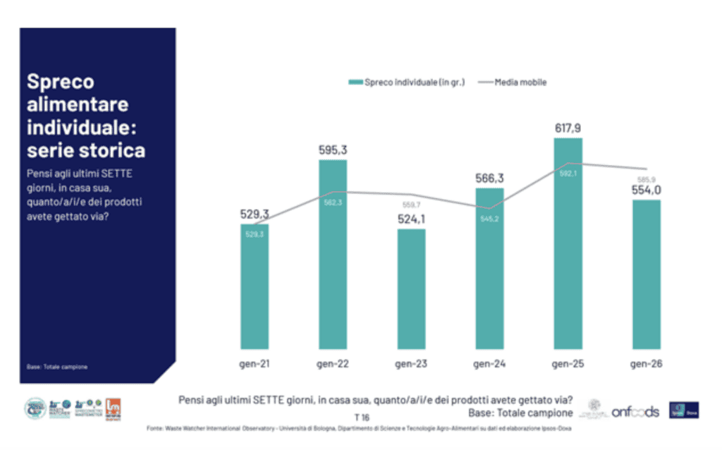 Il Report Italia 2026 fornisce un’indicazione chiara: la quantità di cibo domestico buttato nell’ultimo anno è diminuita del 10%. Attualmente siamo a 554 grammi a settimana.